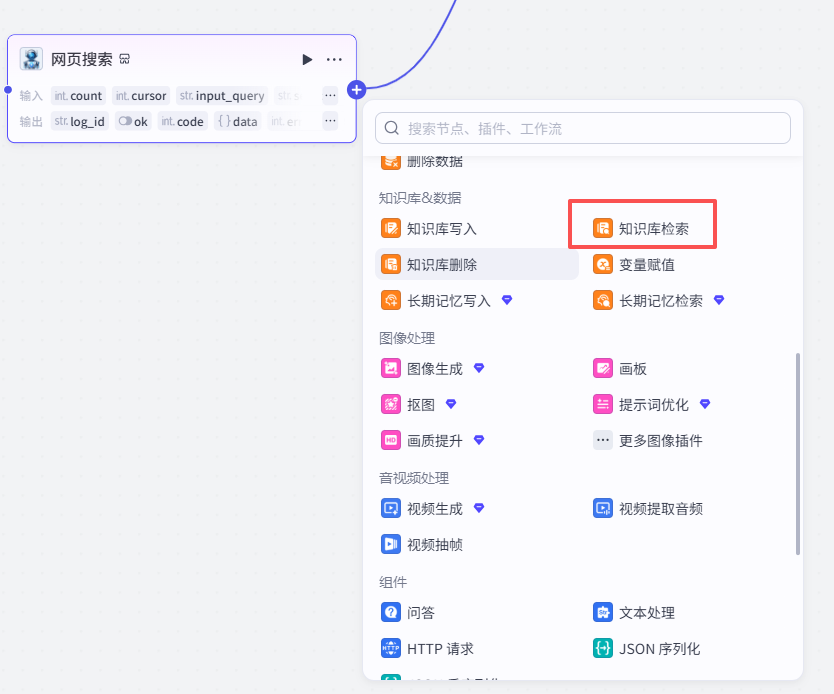 - 在“网页搜索”节点后,拖入 “知识库” 节点。