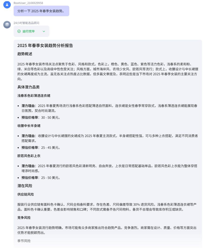 首先我们需要看看这个机器人到底能干什么。假设你输入一个指令:“分析一下2025年春季女装趋势。”