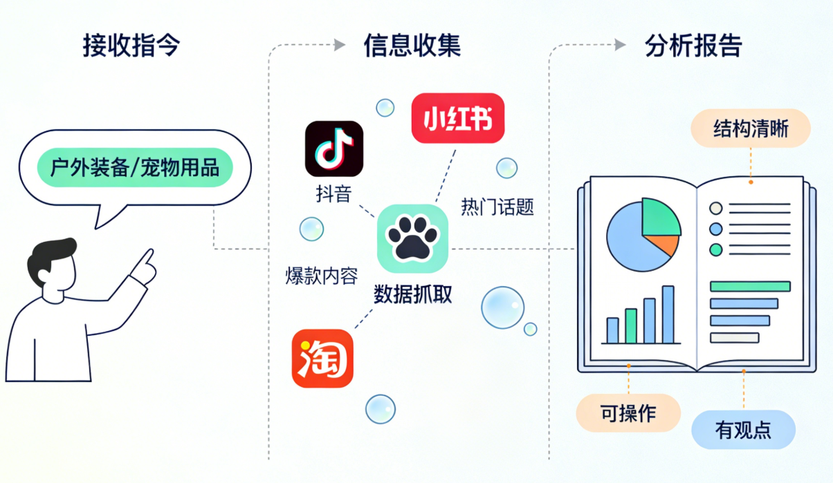 - 接收指令与明确方向:你告诉它你想看哪个领域(例如“户外装备”、“宠物用品”)。