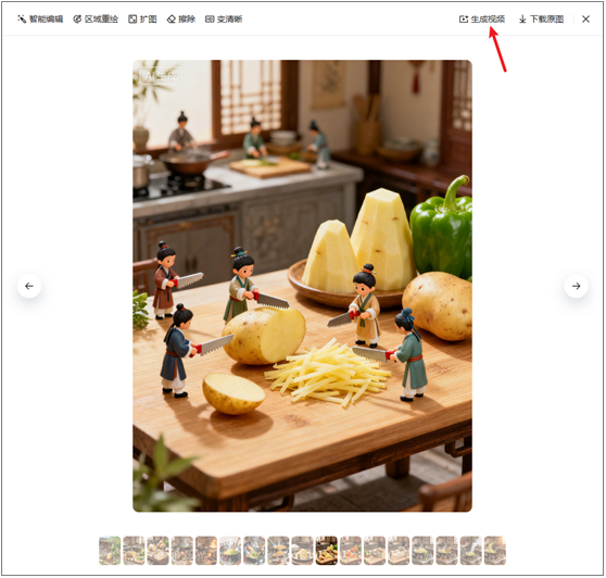 ⑤ 选中满意的图片,点上方【生成视频】,描述词可以直接用图片的提示词,也能加运镜要求,比如 “镜头慢慢拉近,聚焦小人挖土豆的手部动作,土豆被挖出的瞬间有泥土掉落”,