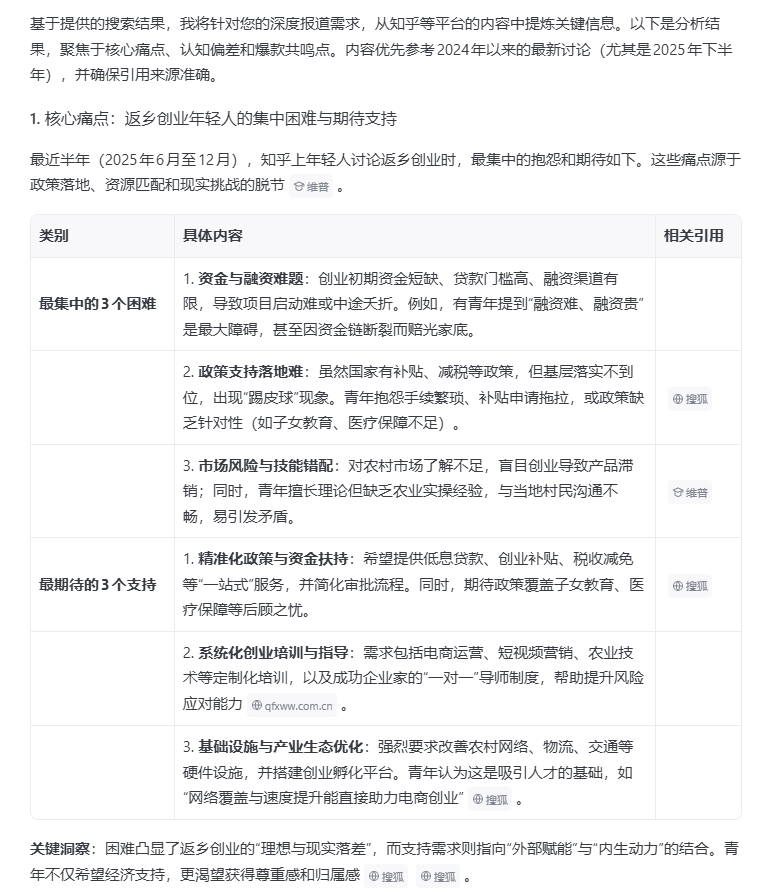 通过这款AI工具,直接调研出知乎里面的真实问答后,我们可以直奔那些最有故事、最有冲突的真实痛点去做采访和调查。为我们节约了很多前期调研时间。