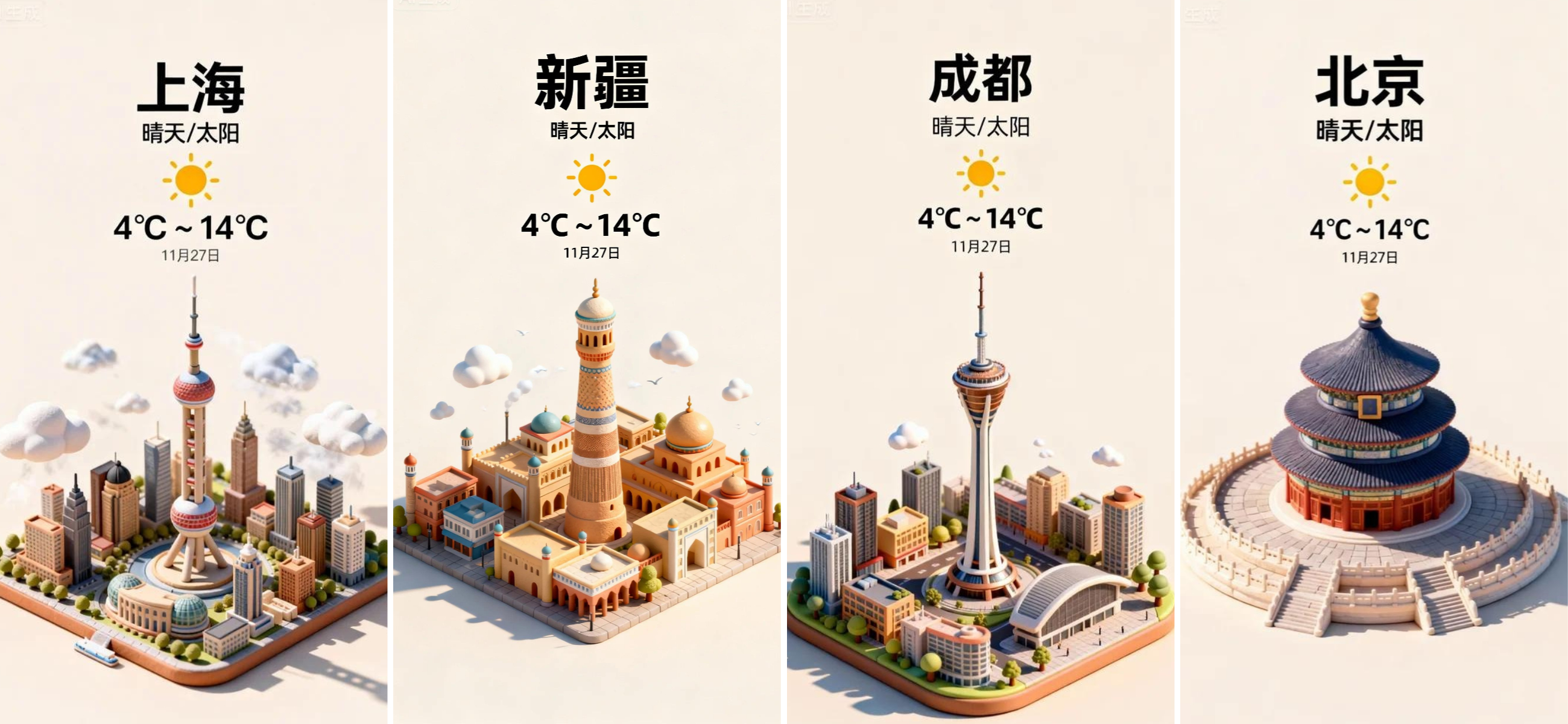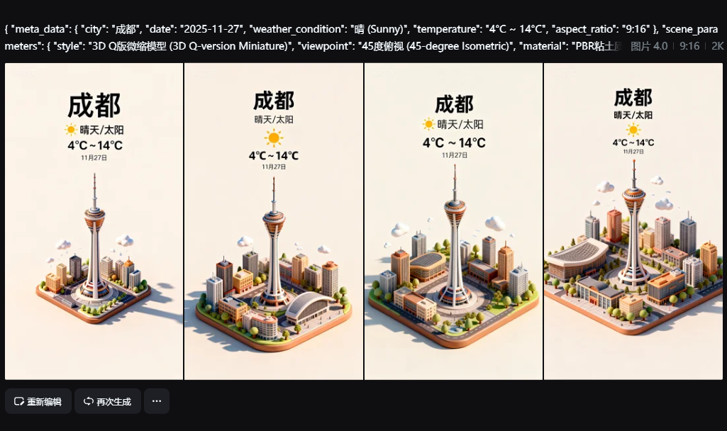 3、点击生成,等 10 秒出 4 张图,选 “微缩感强、温度文字清晰、天气元素明显” 的保存,不满意就重新生成~