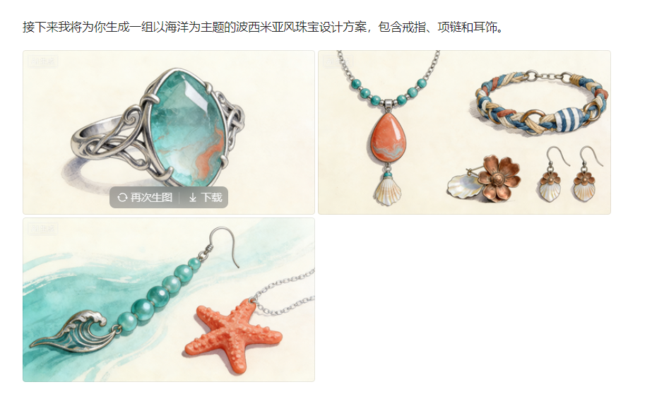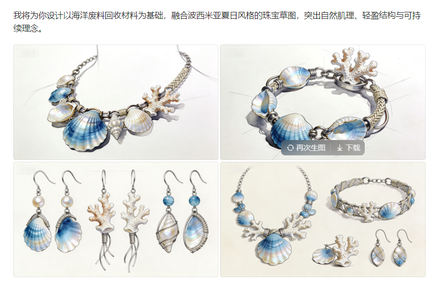 当你输入诸如「夏日」「海洋」「可持续」「手工感」这样的关键词时,AI 能在极短时间内,从大量设计风格、材质形态、装饰语言中,生成多组视觉草案,供你筛选、取舍、再创作。