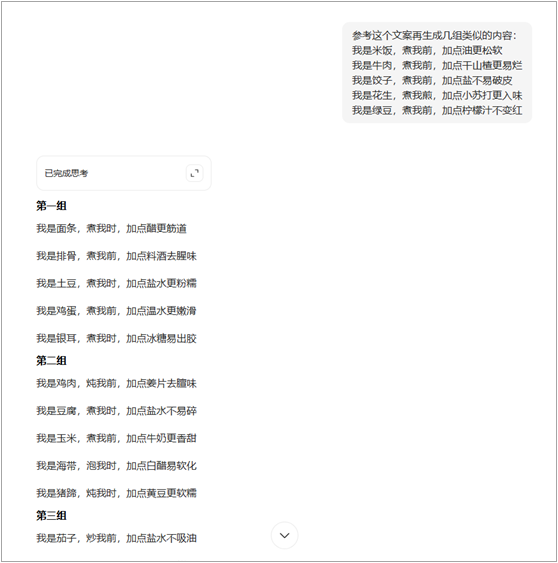① 先攒文案库(直接甩指令,批量出干货),参考指令:“帮我写几组养生食材做饭小技巧文案,格式是:“我是 XX,煮 / 炒 / 蒸 / 焯我前 / 时,加点 XX 更 XX”。