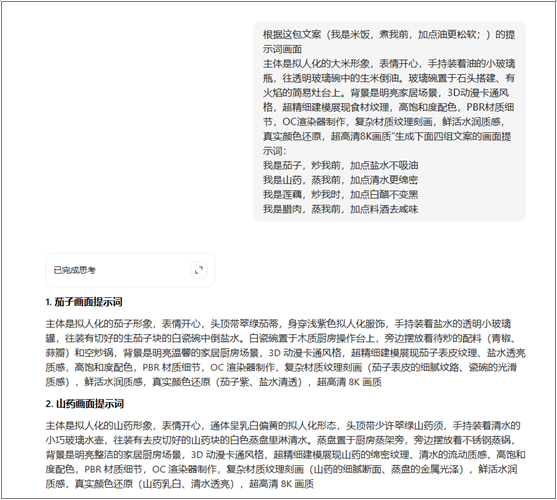 “根据这组文案(我是米饭,煮我前,加点油更松软;)的提示词画面,主体是拟人化的大米形象,表情开心,手持装着油的小玻璃瓶,往透明玻璃碗中的生米倒油。玻璃碗置于石头搭建、有火焰的简易灶台上。背景是明亮家居场景,3D动漫卡通风格,超精细建模展现食材纹理,高饱和度配色,PBR材质细节,OC渲染器制作,复杂材质纹理刻画,鲜活水润质感,真实颜色还原,超高清8K画质”生成下面四组文案的画面提示词:我是茄子,炒我前,加点盐水不吸油;我是山药,蒸我前,加点清水更绵密;我是莲藕,炒我时,加点白醋不变黑;我是腊肉,蒸我前,加点料酒去咸味;