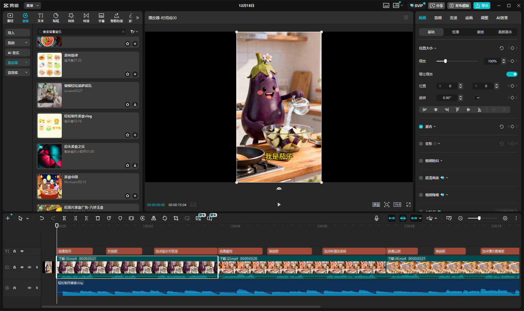 ① 打开剪映,导入所有 3D 食材动画,按食材顺序排列