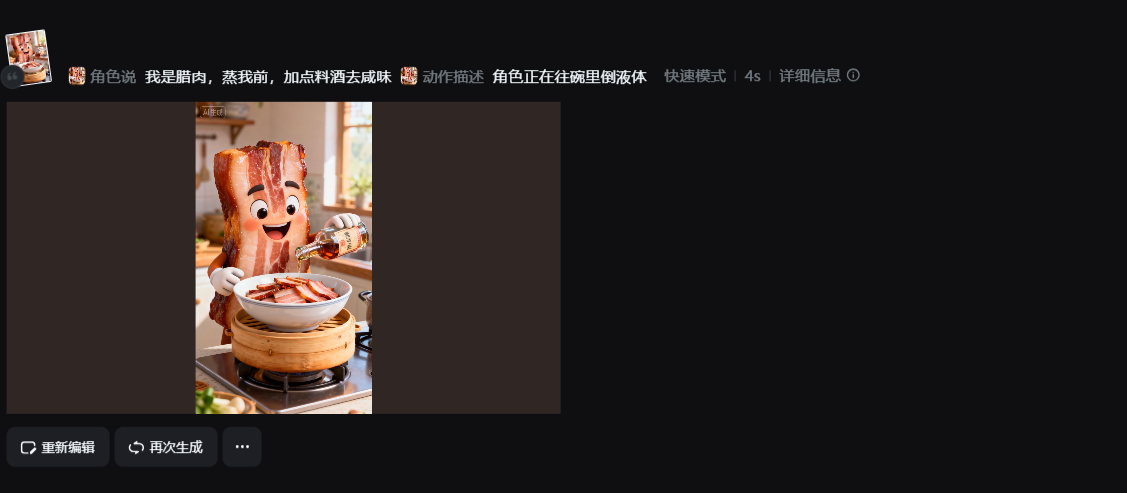 ④ 点击 “生成视频”,10 秒就能出一个 15-20 秒的动态片段,食材会动、还能对口型,直接省了拍视频的功夫!