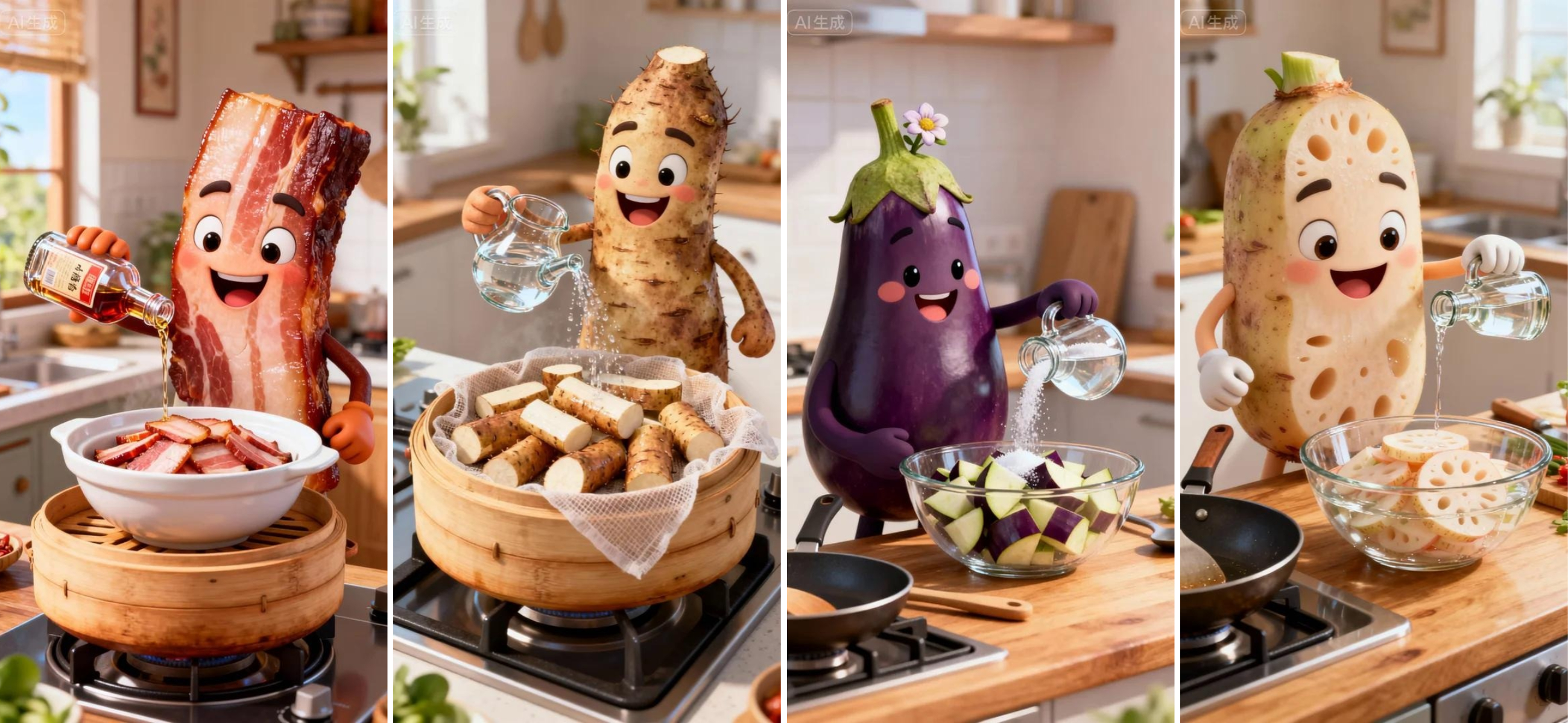 ③ 等 3-5 秒,就能出 4 张不同风格的 3D 图,挑最萌、最贴合文案的保存(比如食材表情够可爱、颜色够鲜艳的)