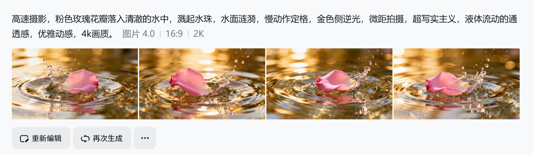 动作提示词:花瓣缓缓飘落,水波荡漾,每一滴水珠的炸裂都清晰可见,运动强度选择“中”。
