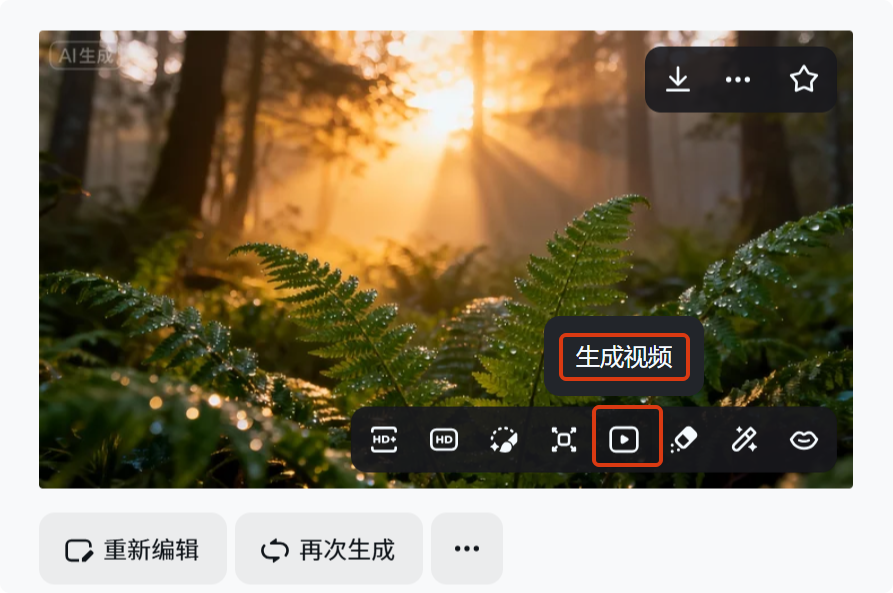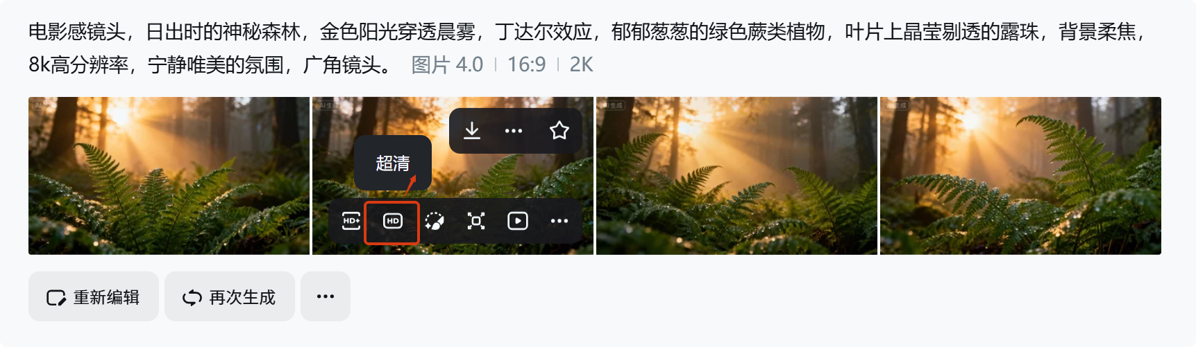 图生视频:选择一张你最满意的生成超清图片,再点击“生成视频”中生成的图片(后面每个镜头都重复这个步骤)。