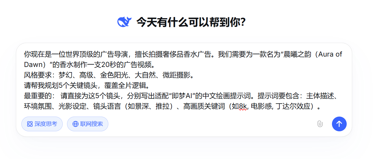 很多新手用AI生成视频,画面很美但连起来像PPT,原因就是缺乏“分镜逻辑”,我们可以先让DeepSeek充当创意总监和提示词工程师。