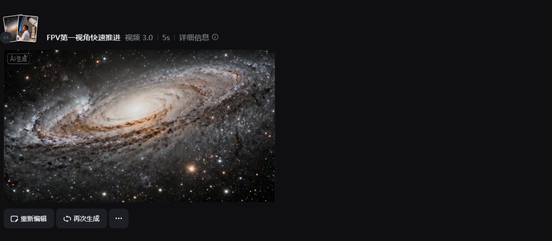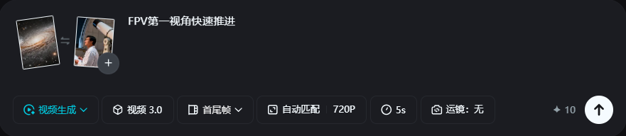 ② 选择「视频 3.0 模型」,输入转场提示词:“FPV第一视角快速推进”,点击生成,开场转场就搞定了!