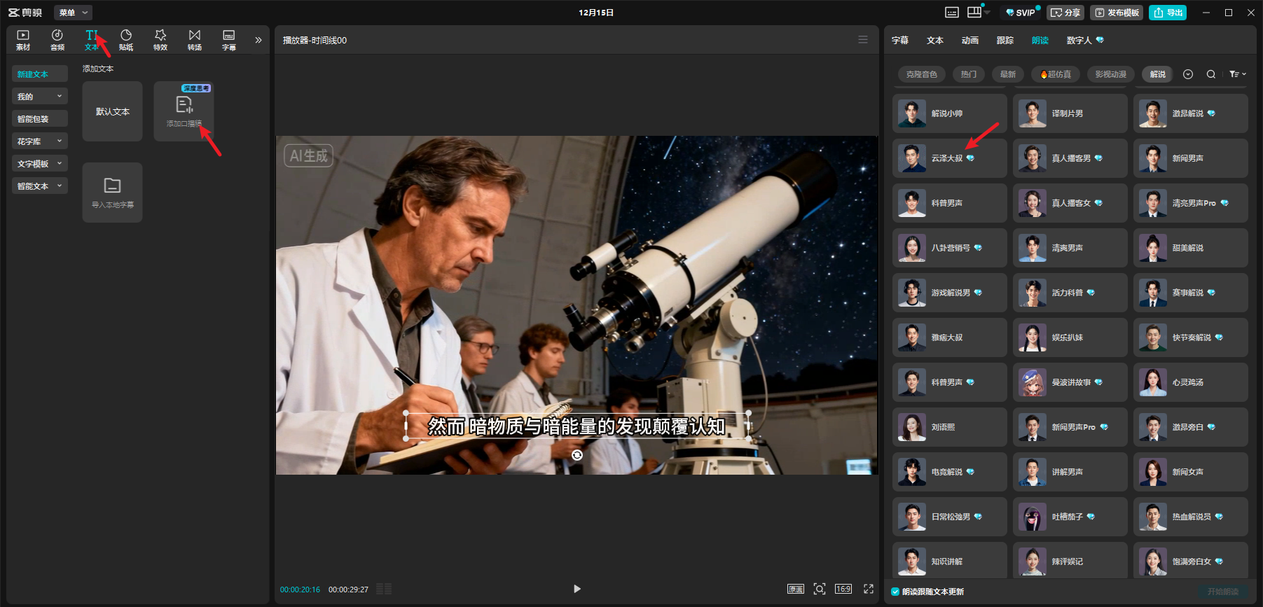 ② 配音:复制豆包生成的文案,用剪映「AI 配音」功能,选 “新闻播报腔” 或 “沉稳男声”,语速调慢 10%,听起来更专业;并「自动识别字幕」功能,一键生成,再调整字体大小适中,方便阅读;