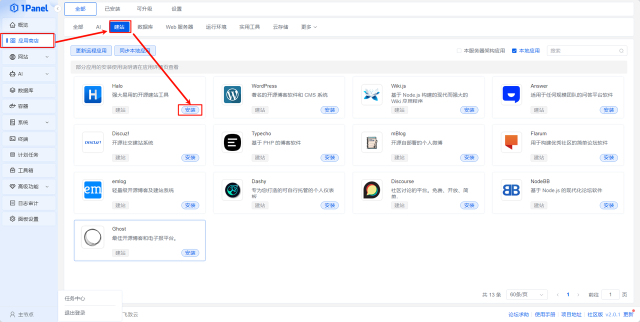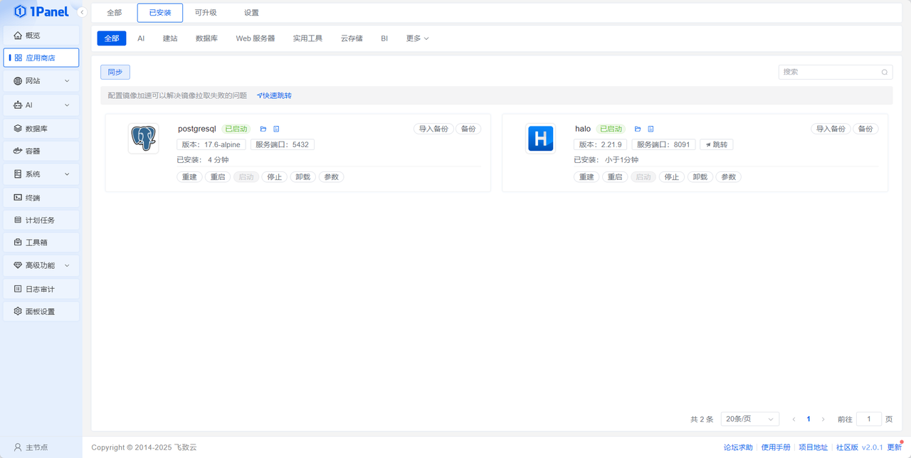应用商店 | 一键安装主流应用(如 Halo、WordPress、MySQL、Redis 等),支持版本管理、启停、配置修改与卸载 |