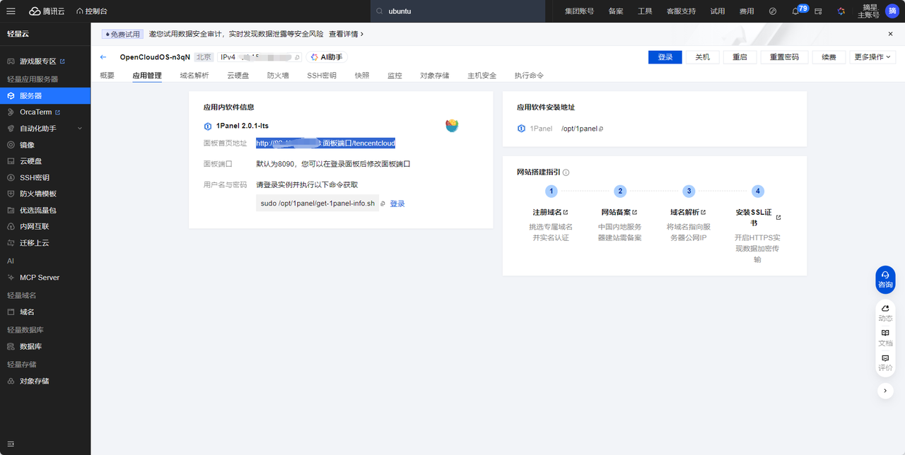 重装完毕之后,在应用管理中查看1Panel的面面登录地址信息
