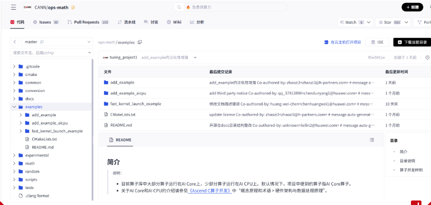- docs 目录存放项目的详细文档。涵盖算子开发指南(如 VectorAdd、Softmax 等基础算子的开发步骤)、调试调优工具使用说明、API 支持清单等,同时支持 HTML 格式文档生成,适配开发者的查阅习惯。