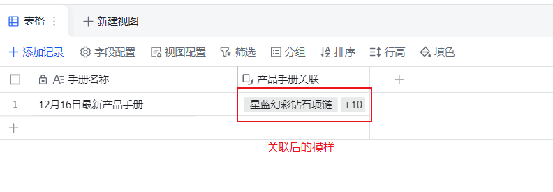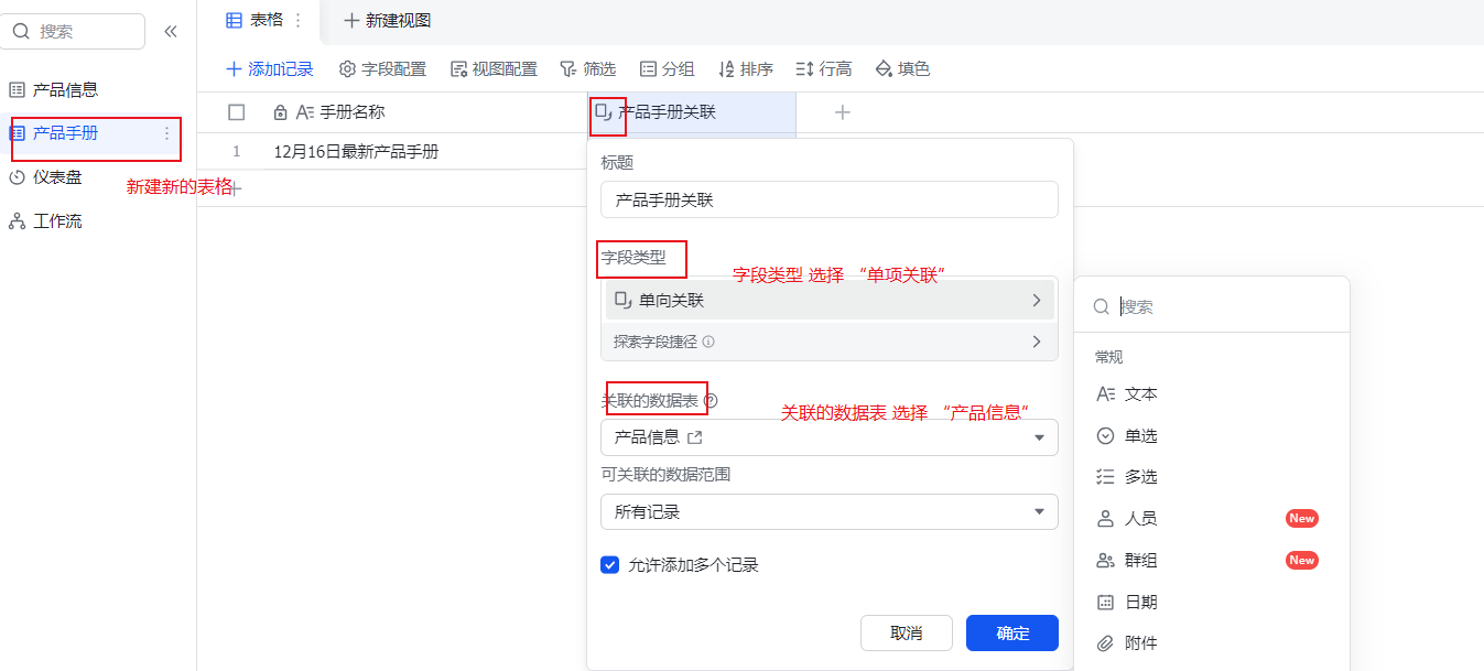 可以新建一列为【产品手册关联】,在“字段类型”选择“单项关联”,并在“关联的数据表”中选择之前的“产品信息”表格。