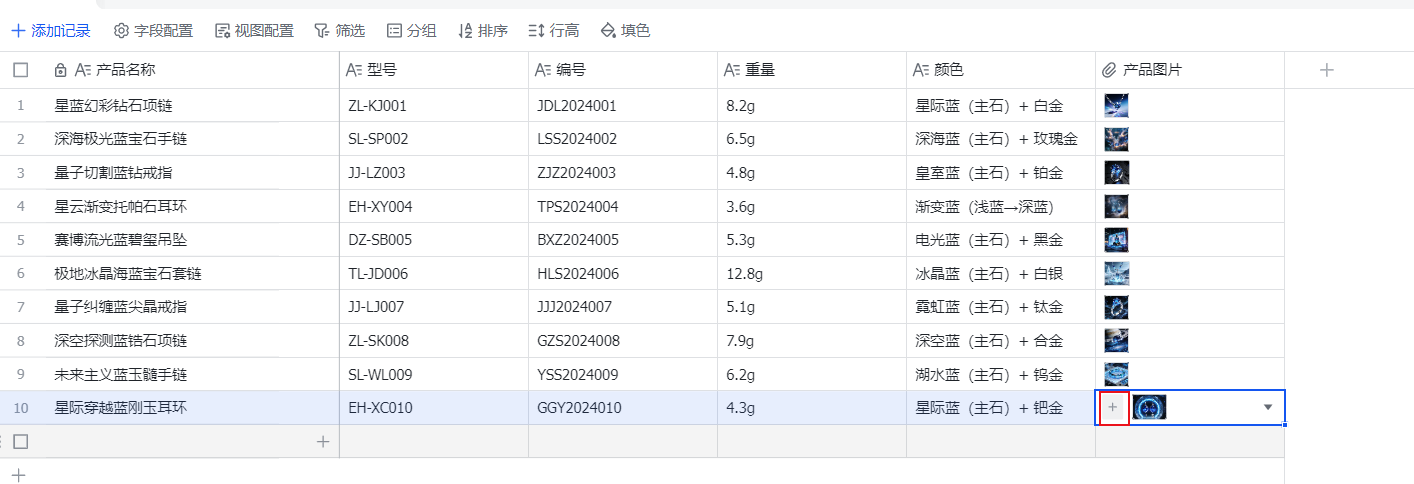 上传图片时需要注意,【产品图片】列应设置为“附件”类型,才能上传图片;当表格框内出现“+”,则可拖拽图片到目标表格中。