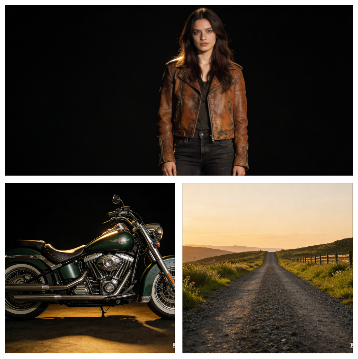 这里我用一个例子来进行说明,我用豆包给我生成了三张图,分别是一张人物图、一张摩托车图和一张乡村小路图。