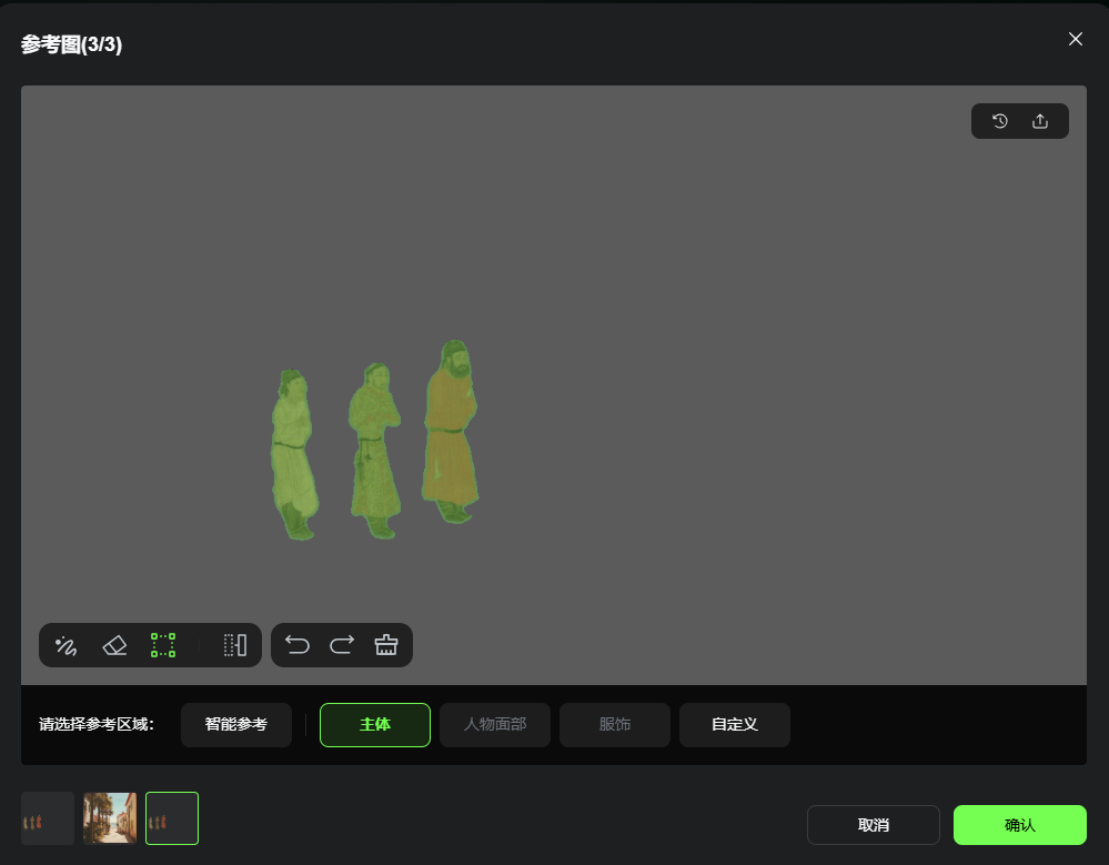 举个例子,我上传了这张图,我想让 AI 知道前面红色的人才是我的主体,我就选择“主体”后选择上面的“方形框”将它框住就行。