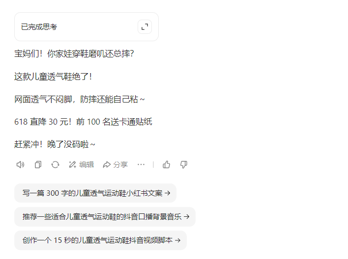 现在的李姐,再也不用熬到凌晨改文案了 —— 用 AI 工具,按上面的步骤操作,半小时就能生成 5 套适配不同渠道的文案,门店海报、朋友圈推广、抖音口播一站式搞定。上次她用 “限时 3 天!儿童防摔鞋满 100 减 30,限量 30 双” 的文案,周末门店客流直接涨了 40%,顾客都说 “看到文案就想进店看看”。