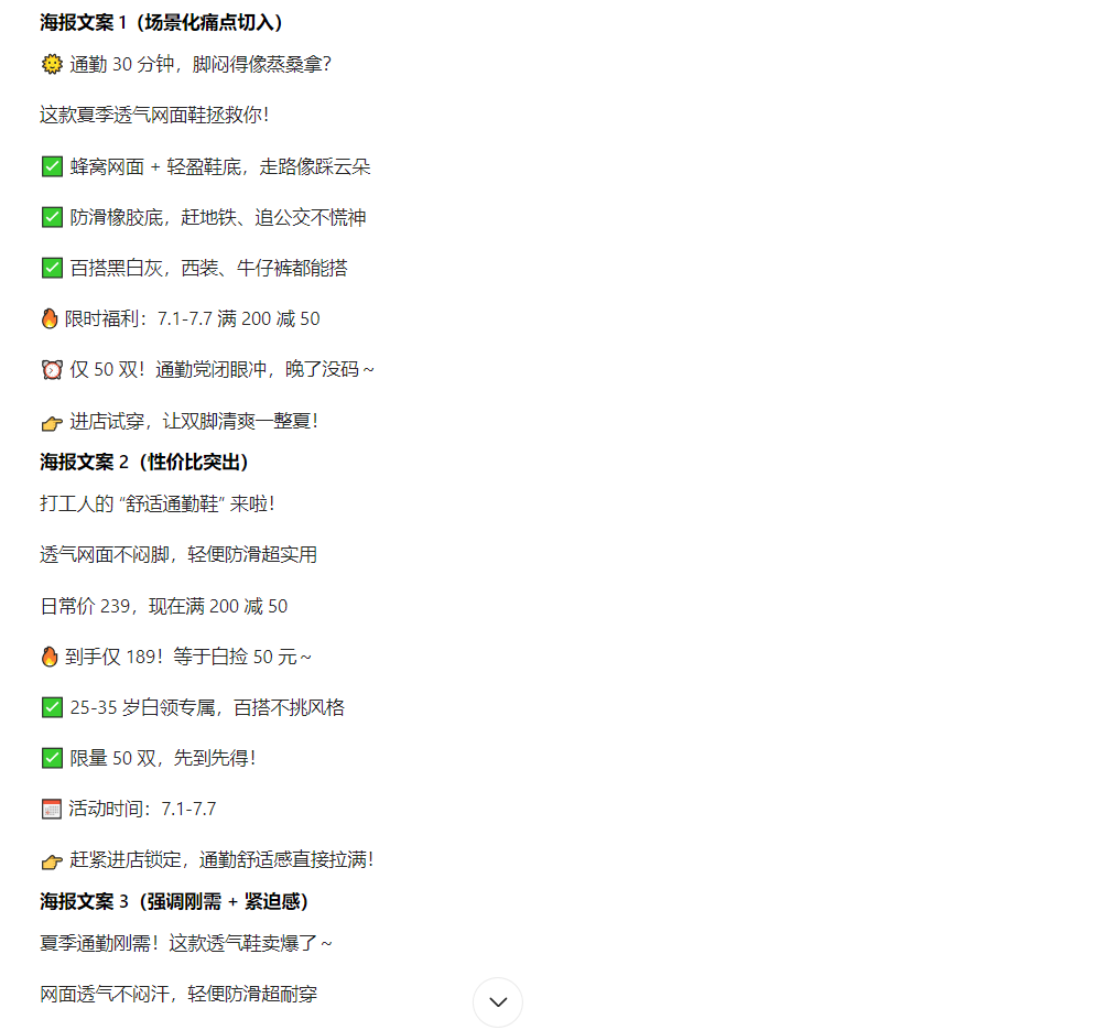 比如 AI 生成核心文案:“通勤党必备!夏季透气运动鞋满 200 减 50,限量 50 双,舒适不闷脚,快来门店抢购~”