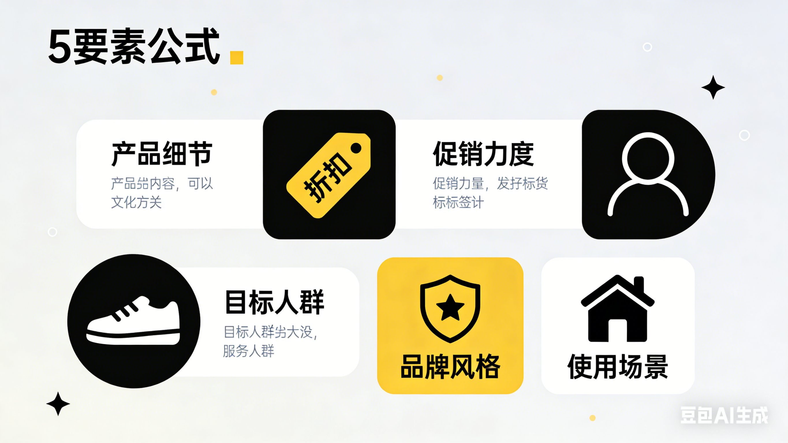 记住 “5 要素公式”:产品细节 + 促销力度 + 目标人群 + 品牌风格 + 使用场景,再加上 “渠道要求”,就是完美提示词。