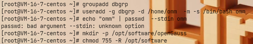 useradd -g dbgrp -d /home/omm -m -s /bin/bash omm