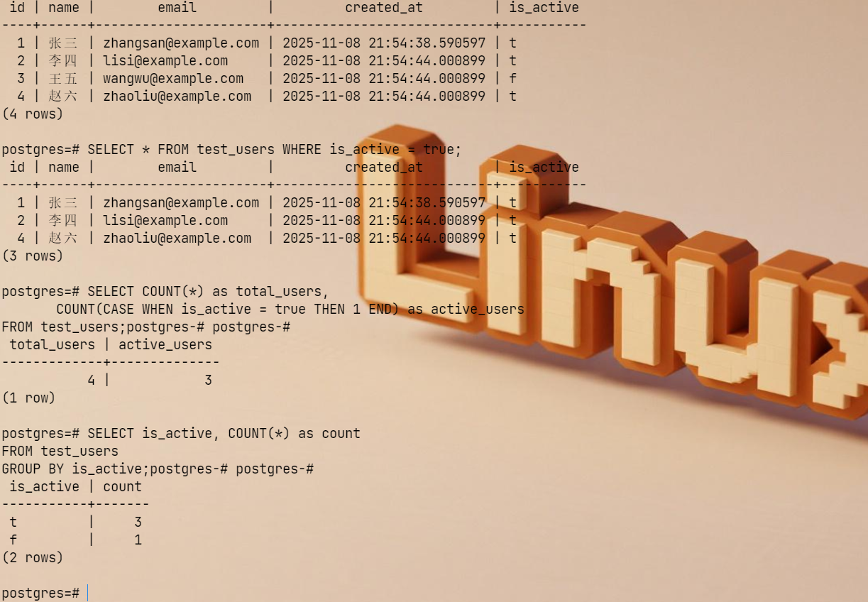 SELECT * FROM test_users WHERE is_active = true;