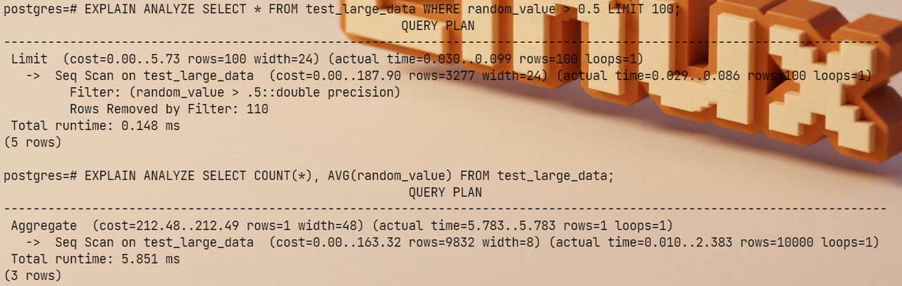 EXPLAIN ANALYZE SELECT * FROM test_large_data WHERE random_value > 0.5 LIMIT 100;
