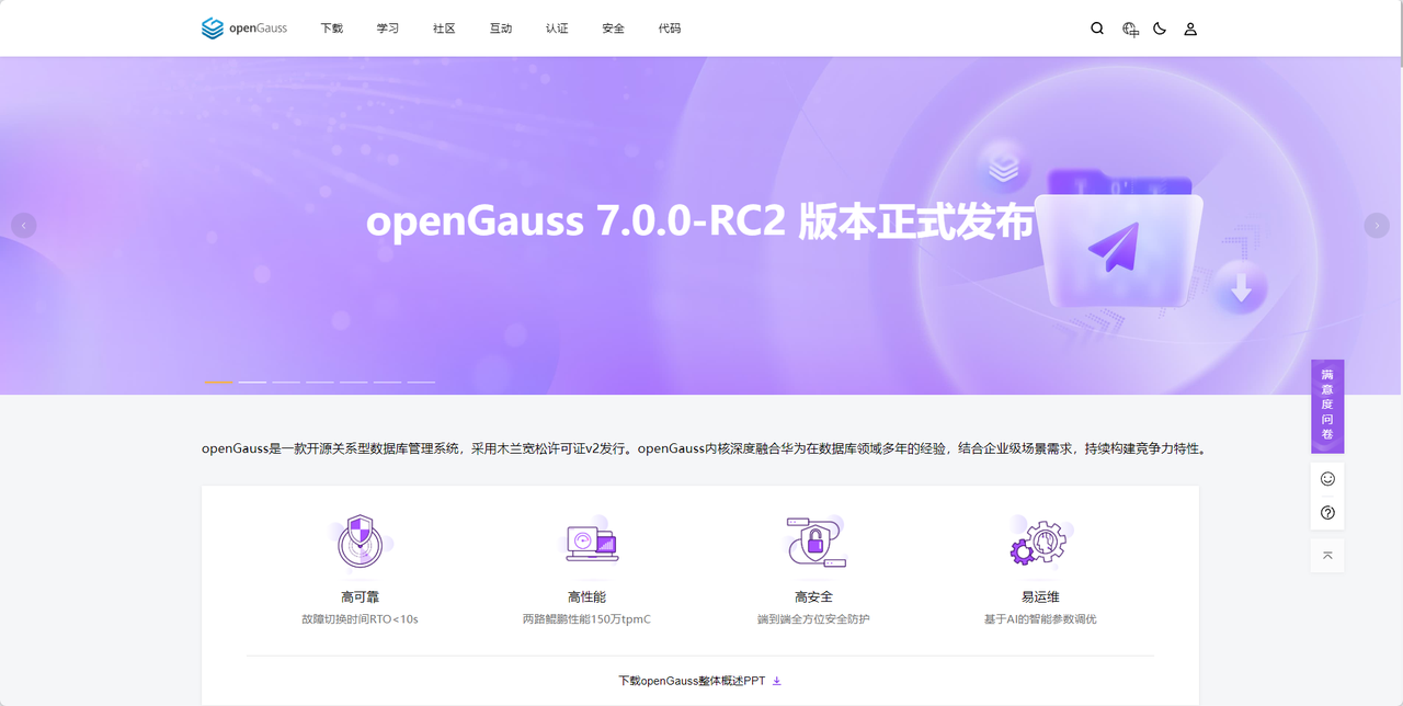 openGauss 是一款源自华为、专为企业级应用场景打造的高性能开源关系型数据库管理系统(Relational Database Management System, RDBMS)。该项目于 2020 年 6 月 30 日正式对外开源,致力于构建一个开放、协作、创新的数据库生态。