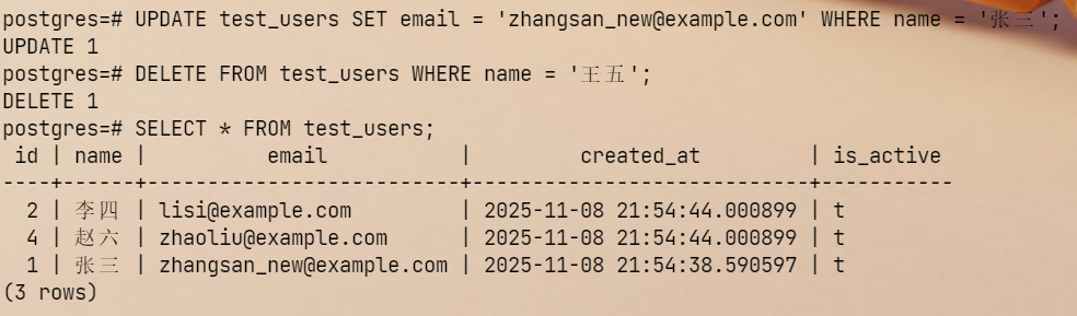 UPDATE test_users SET email = 'zhangsan_new@example.com' WHERE name = '张三';