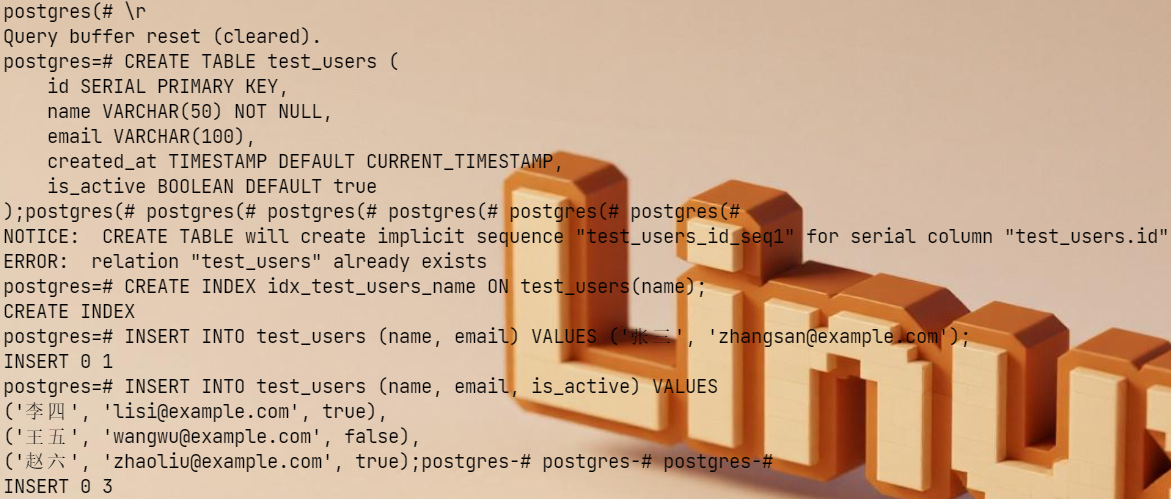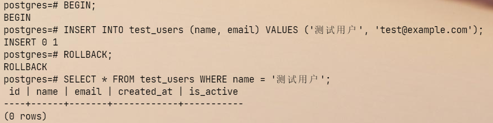 INSERT INTO test_users (name, email) VALUES ('测试用户', 'test@example.com');