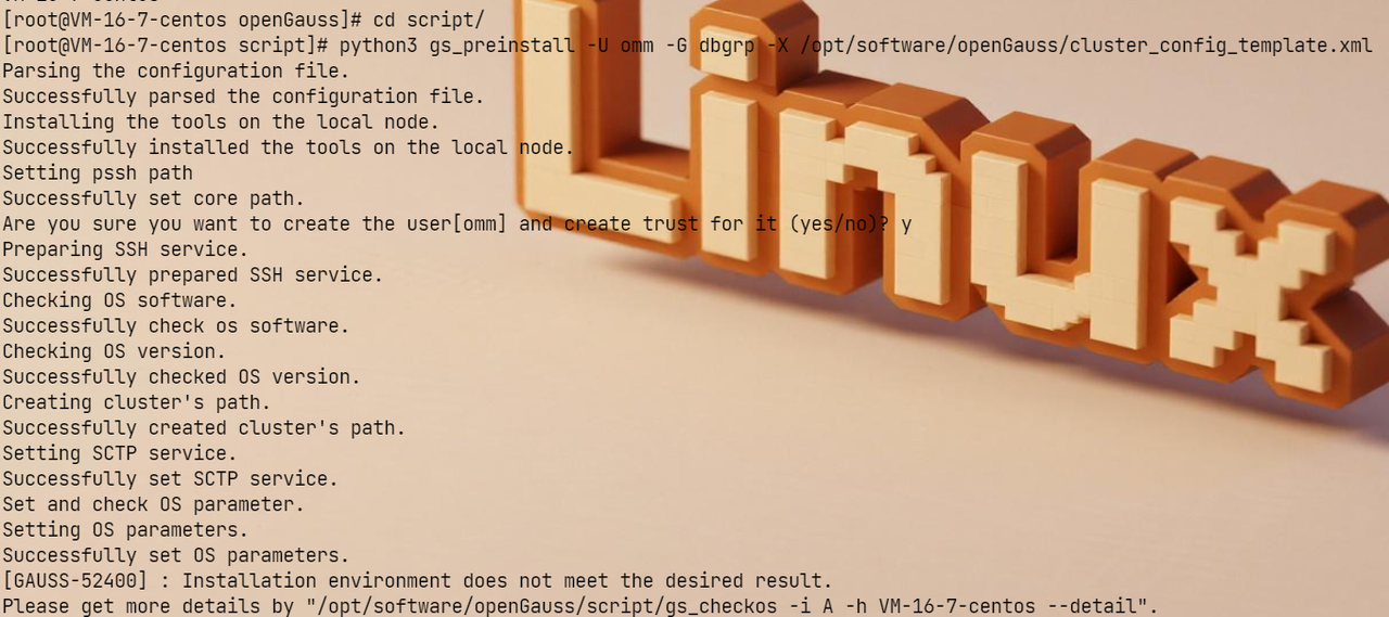 python3 gs_preinstall -U omm -G dbgrp -X /opt/software/openGauss/cluster_config_template.xml