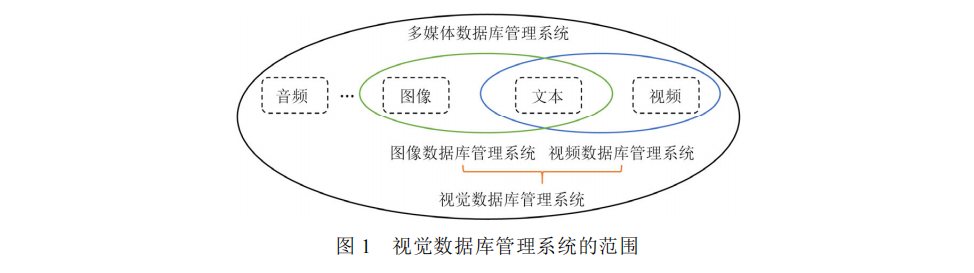 图1明确了本文研究的系统范围,将图像和视频两类多媒体数据管理系统统一归类为“视觉数据库管理系统”,为后续讨论奠定基础。
