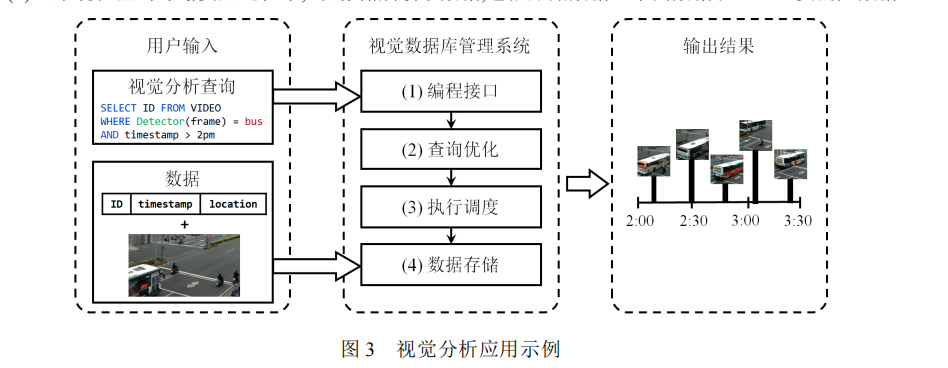 图3通过一个具体应用示例,直观地说明了视觉数据库管理系统的典型工作流程和层次结构,帮助读者理解系统如何协同工作以响应用户查询。