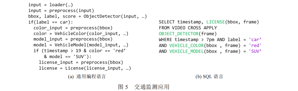 比如在交通监测场景中,要查询“晚7点后出现的红色SUV并识别车牌”,用通用编程语言需要写50多行代码(加载视频、调用检测模型、过滤颜色、识别车牌),就像顾客用“口头说”详细描述商品特征,很麻烦;而用扩展了自定义函数的SQL,只需几行代码: