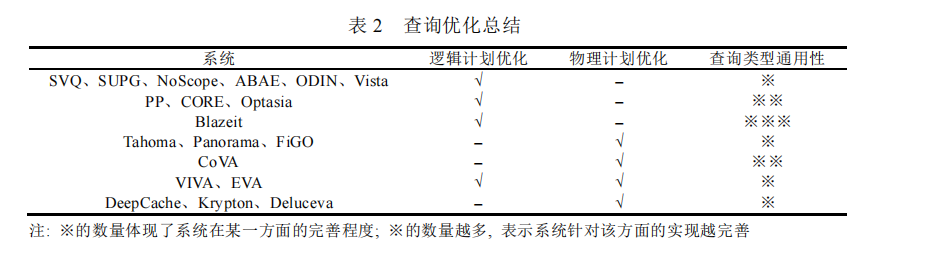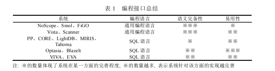 表1从“编程语言”“语义完备性”“易用性”三个维度对比了主流系统——比如NoScope用通用编程语言,能描述复杂语义(语义完备性★★★),但需要写大量代码(易用性★);Optasia用SQL扩展,只需几行代码(易用性★★★),但复杂语义描述能力稍弱(语义完备性★★),帮用户快速判断“哪种对话方式更适合自己”。