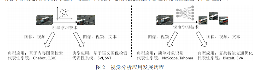 图2展示了视觉分析技术从基于特征相似性的检索向基于深度学习的多模态、复杂场景分析的演进过程,体现了技术发展的脉络。
