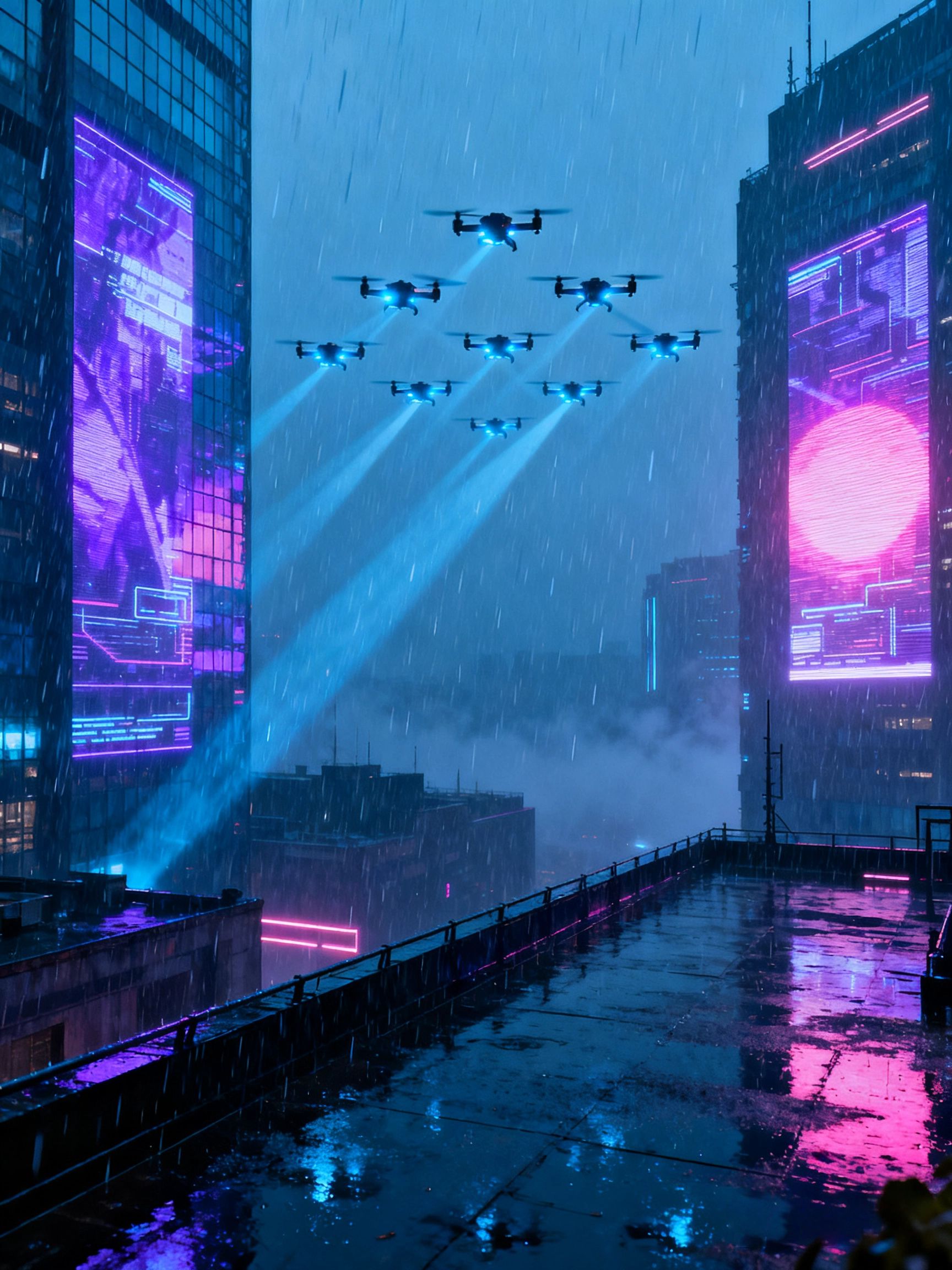 “赛博都市天际线,全息广告投影在雨幕中折射,无人机群掠过霓虹建筑,冷蓝色调,宽幅21:9,电影《银翼杀手》风格”