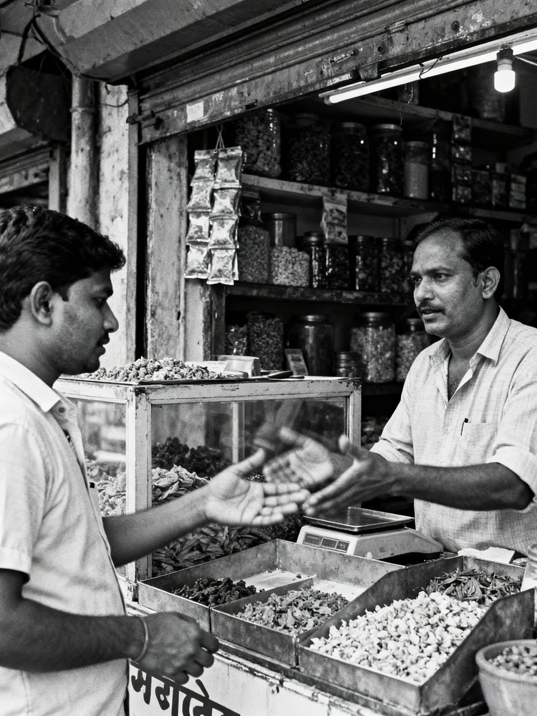 “孟买街头小贩摊前,顾客与商贩讨价还价,手部动作模糊,35mm胶片颗粒感,黑白纪实风格”