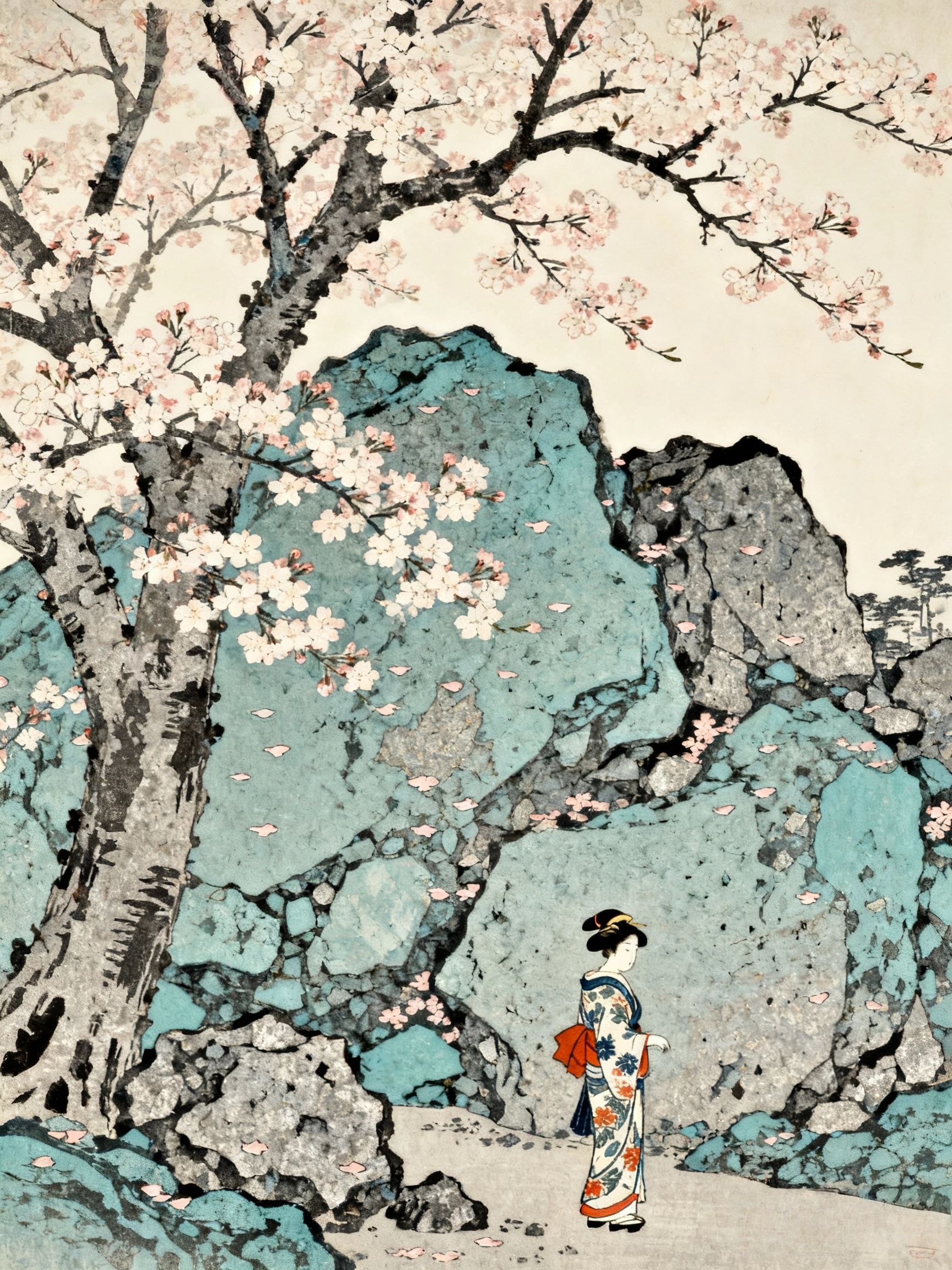“樱花树下的艺伎,和服花纹如葛饰北斋《富岳三十六景》,留白构图,矿物颜料质感”