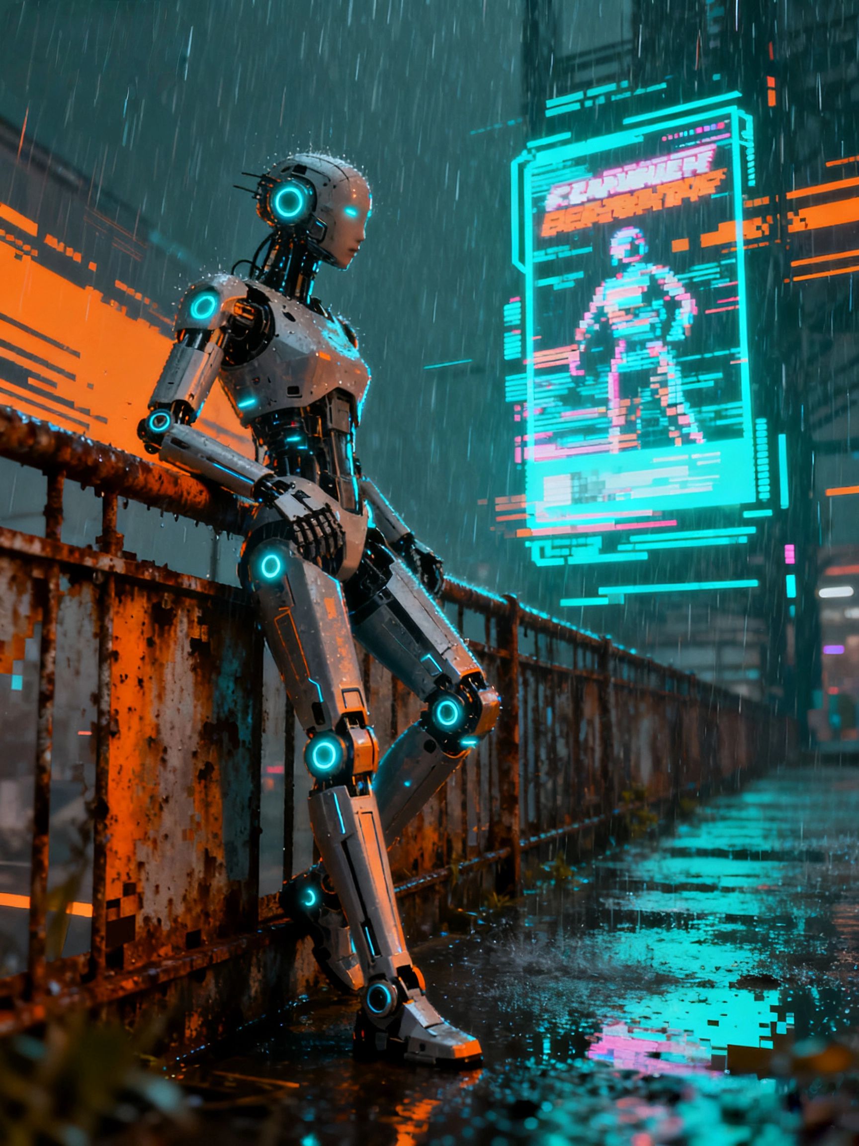 “赛博格半机械人倚靠锈蚀铁栏,全息广告在雨中闪烁,故障特效,青橙色对比,蒸汽波风格”