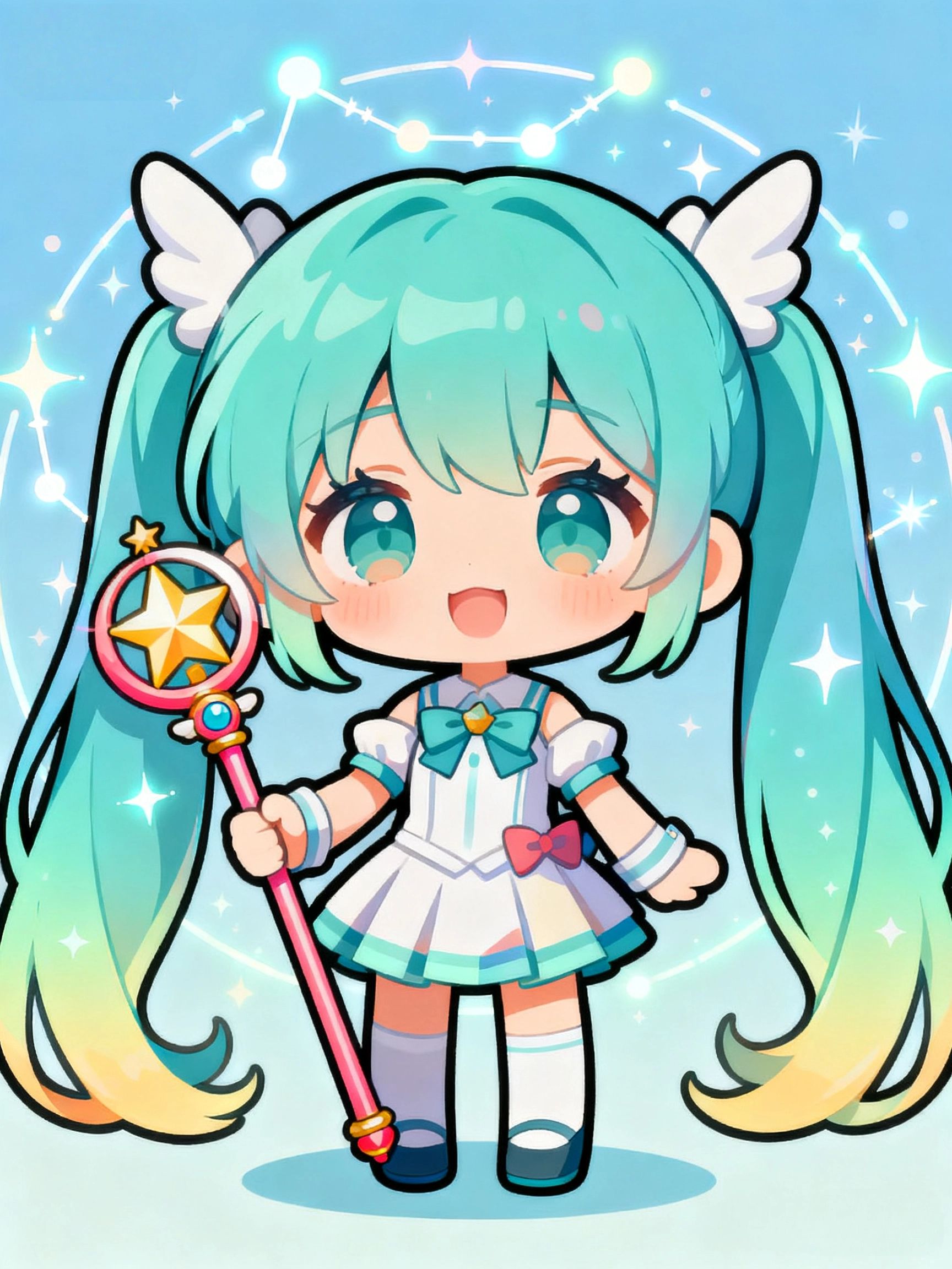 “双马尾少女手持魔法杖,背后浮现星座光效,Q版大头比例,渐变发色,赛璐璐上色法”