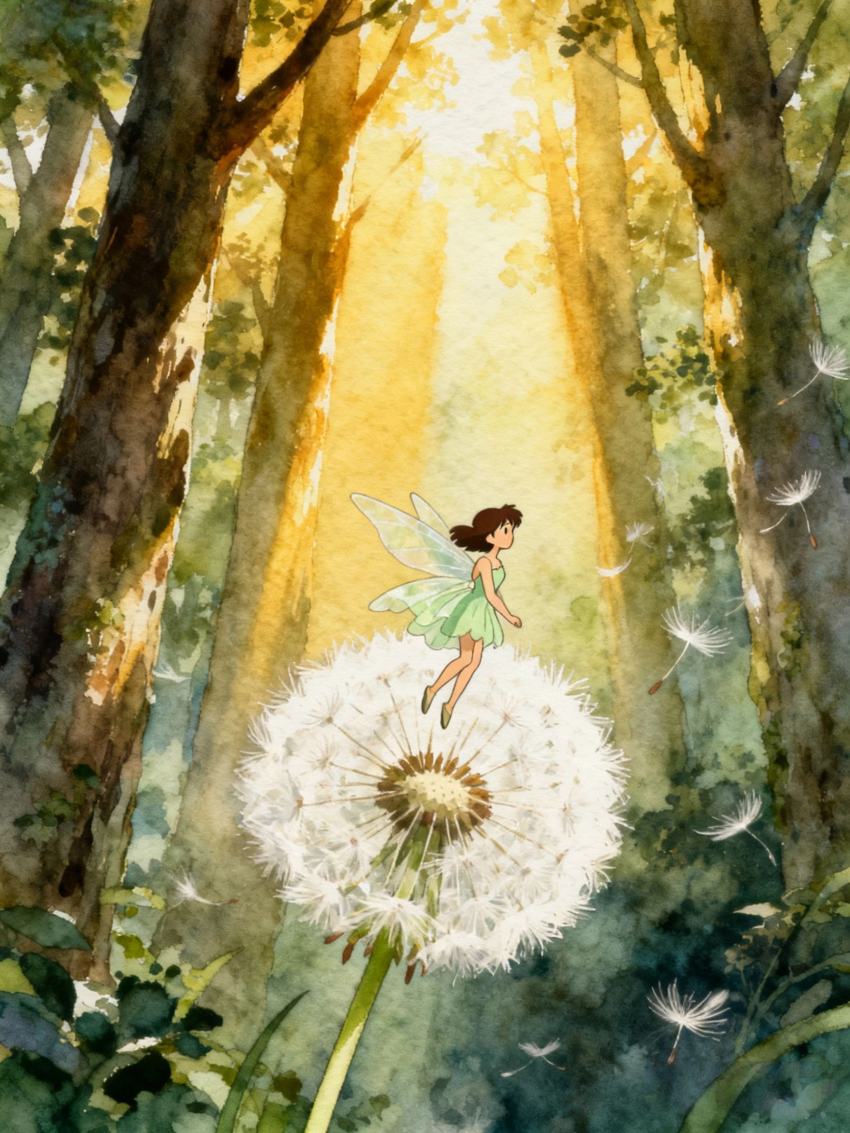 “森林精灵乘着蒲公英飞行,阳光穿透树冠形成光柱,水彩纸纹理,宫崎骏《风之谷》风格”