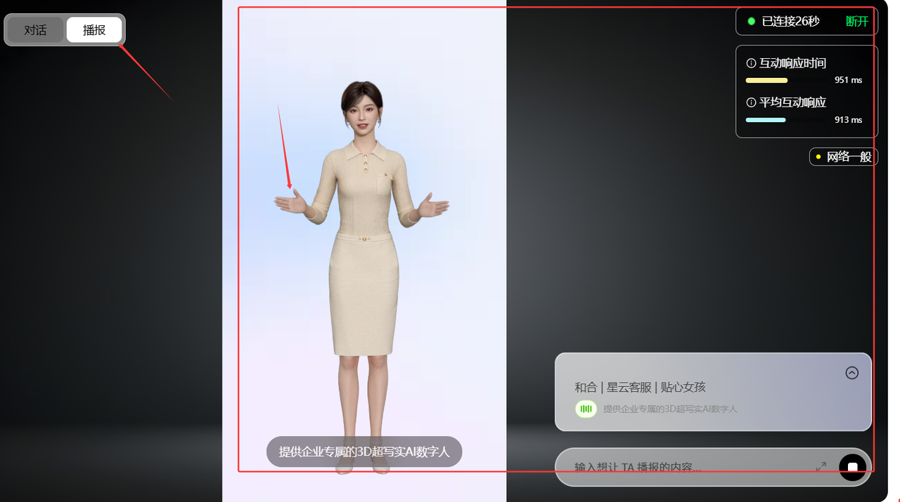- AIGC驱动层面,它实现了从“口型同步”到“全身体语言”的跨越。当我输入一段富有情感的文本时,数字人不仅播报出来,其眼神的流转、头部的微倾以及随之产生的手势,全部由AI实时生成,与语义高度契合,表现力令人惊叹。