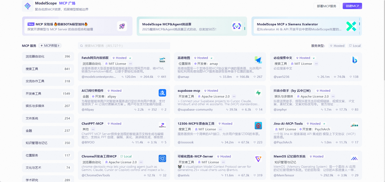 MCP广场是魔搭社区最具创新性的功能之一,它基于Model Context Protocol协议,为开发者提供了一个标准化的工具集成平台。在这里,您可以找到地图服务(如高德地图MCP)、支付接口(支付宝订阅服务)、数据库连接(Supabase集成)、浏览器自动化、知识记忆系统(MemOS)等数百种即插即用的智能工具。这些MCP服务就像乐高积木一样,让开发者能够快速构建具备真实世界交互能力的AI应用。在我的Vibe Coding作品中,我集成了多个MCP服务,实现了从用户需求理解到外部API调用的完整闭环,让应用不再局限于简单的对话,而是能够真正解决实际问题。