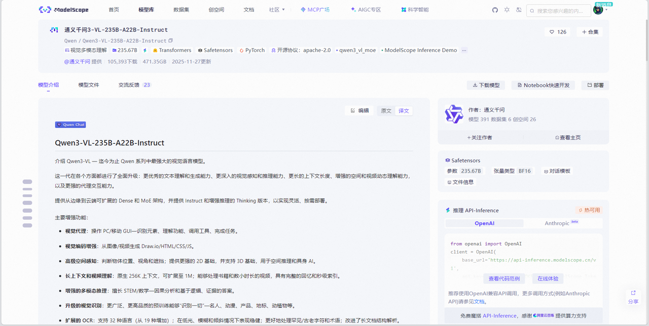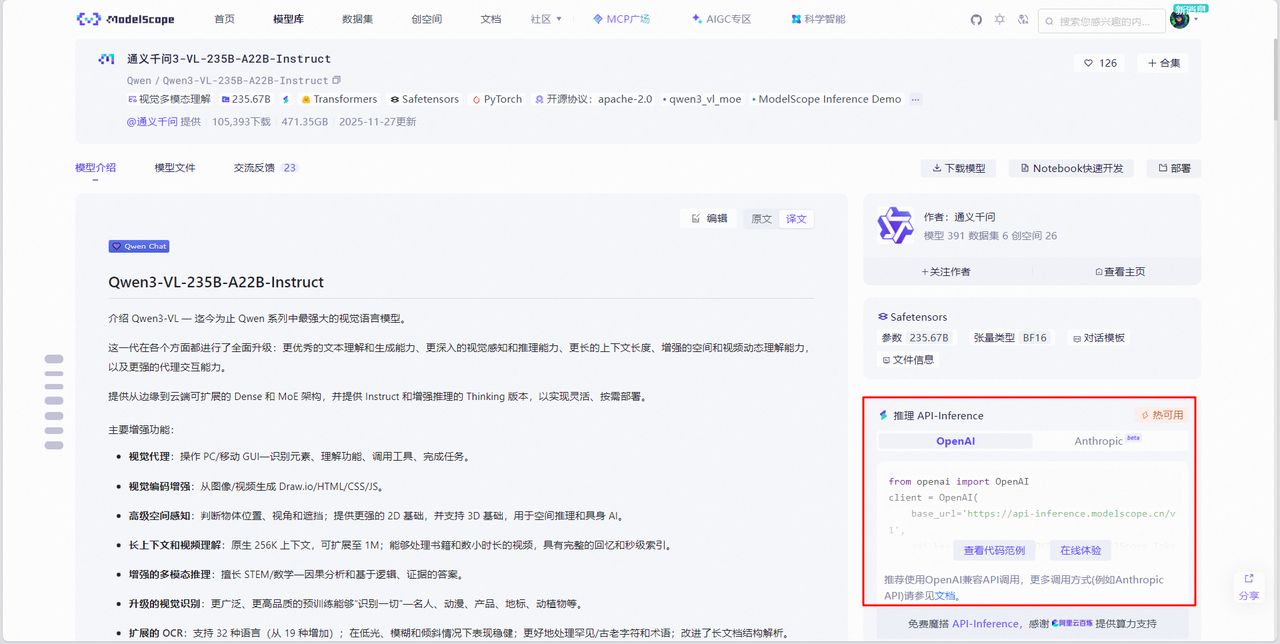 在Qwen3-VL-235B-A22B-Instruct的模型介绍界面右侧可以看到魔搭社区和通义千问官方给出的推理 API-Inference代码示例