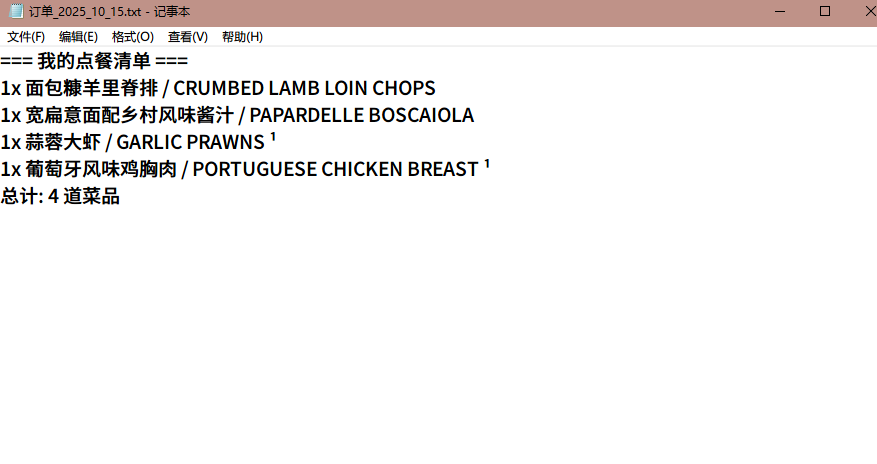 点击生成订单汇总,会生成一份刚刚的点菜TXT格式的清单: