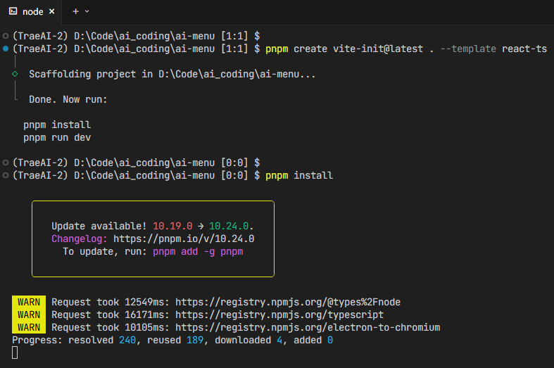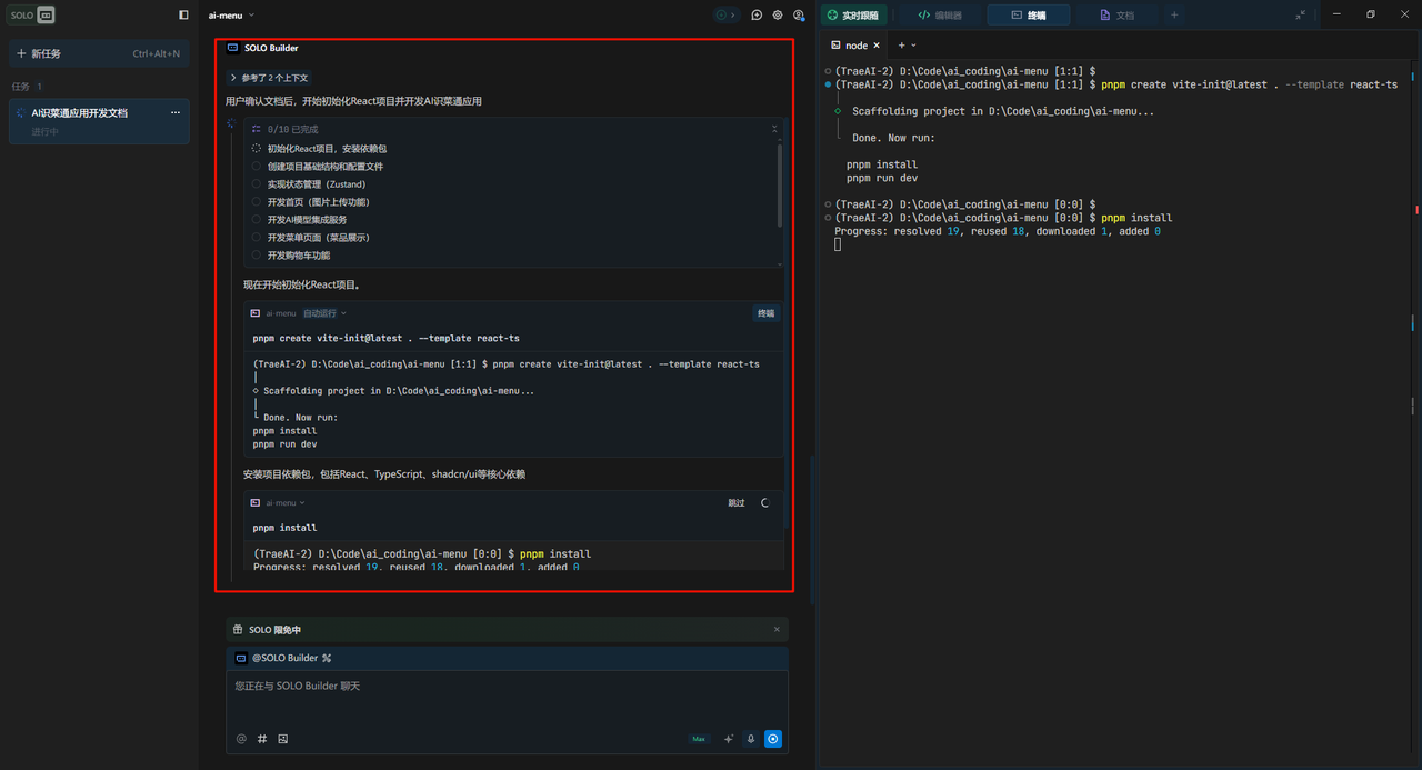 Trae Solo会在开发的过程中自动下载依赖、创建配置文件、生成函数、运行终端,运到的问题也都会被当做上下文继续完善开发: